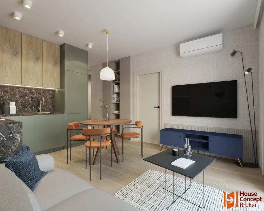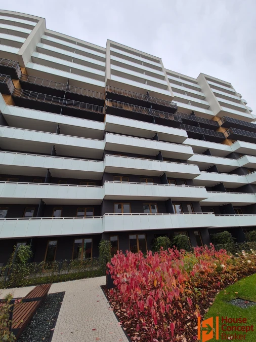• Przemyślany układ 40 m² – salon z aneksem kuchennym, sypialnia, łazienka, duża loggia